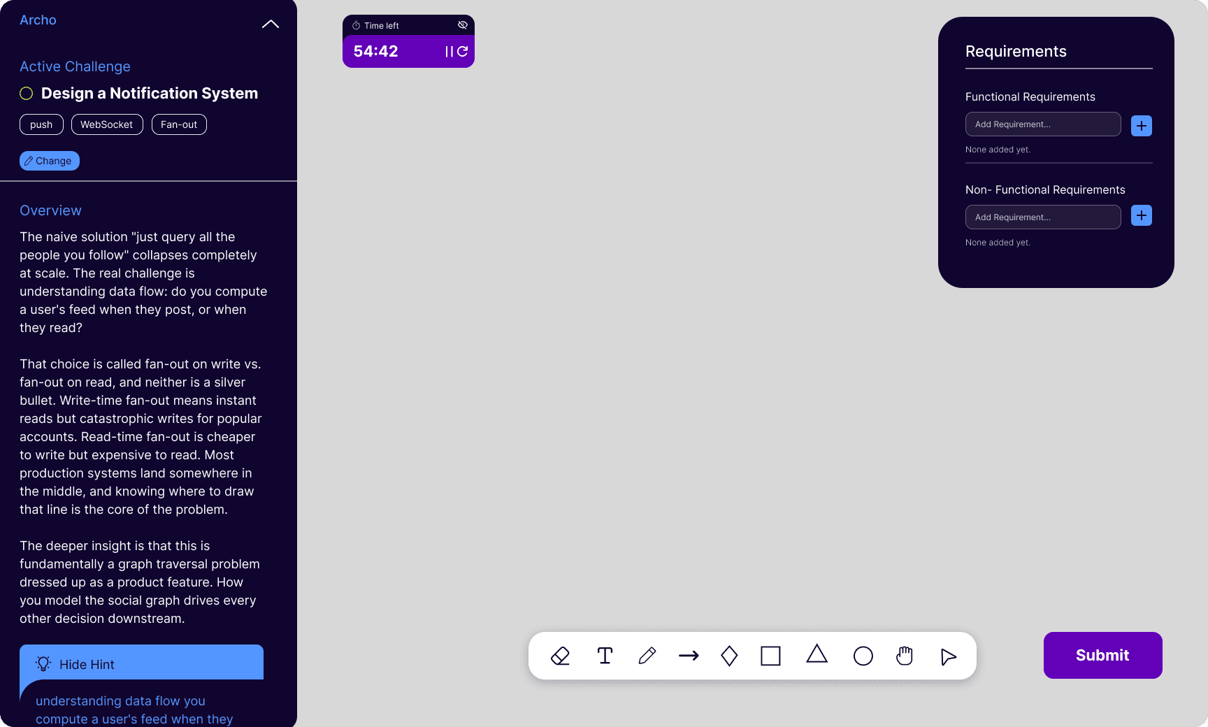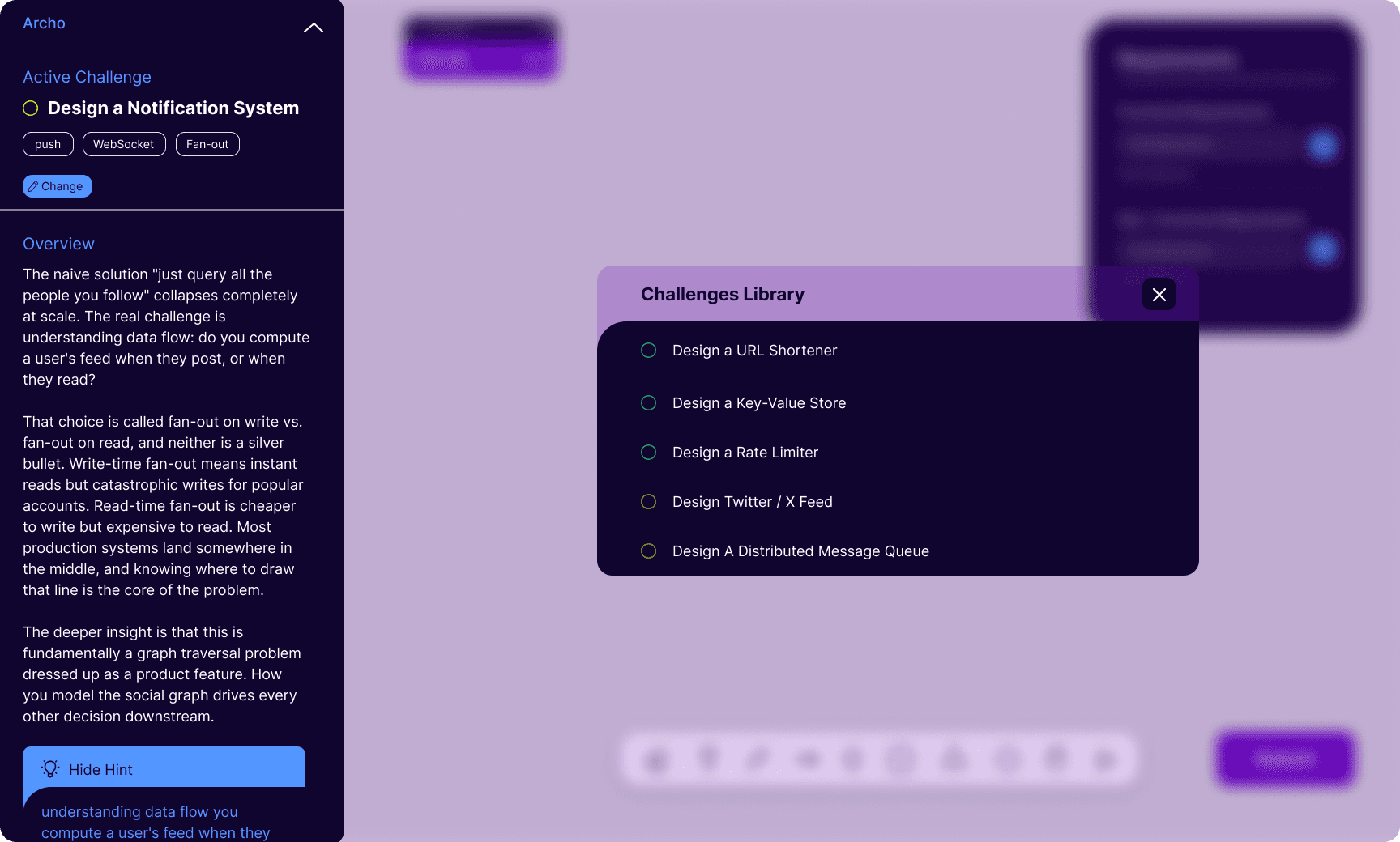 A dedicated platform designed to help software developers prepare for design system architecture interviews, featuring practical challenges and an integrated whiteboard for architectural mapping.