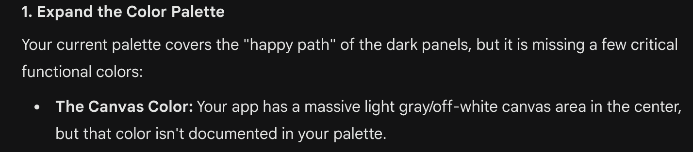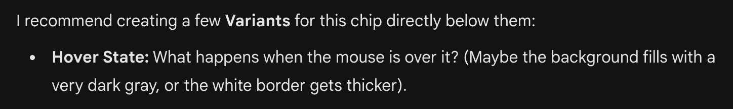 Next, I wanted to validate my design system and ensure it was truly production ready. I used Gemini as an AI consultant. Following this consultation, I made precise adjustments, such as expanding the color palette, and adding missing component states, to make the design system fully complete.