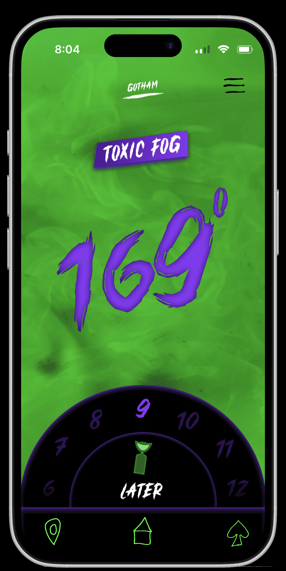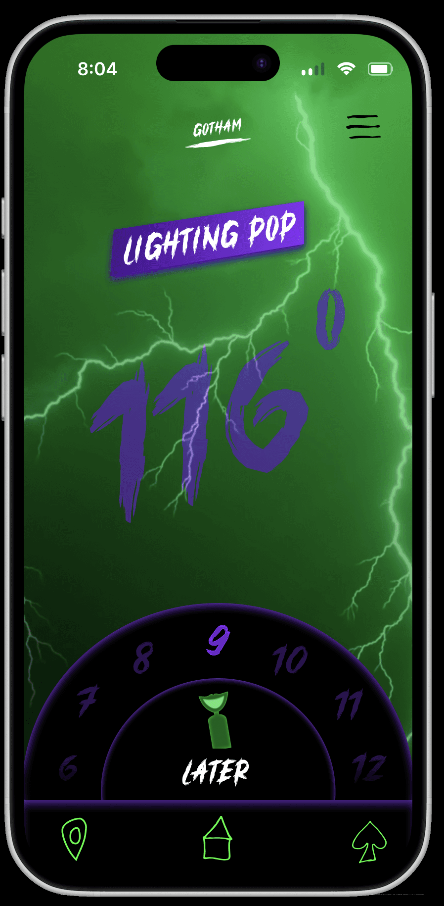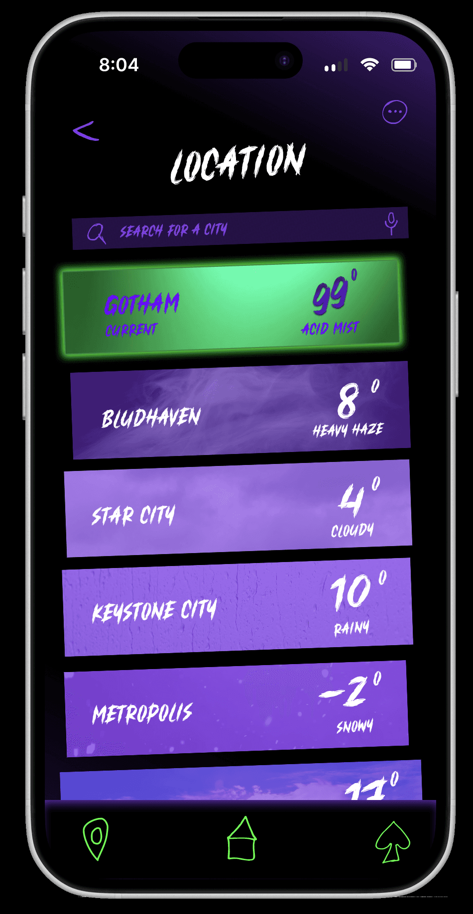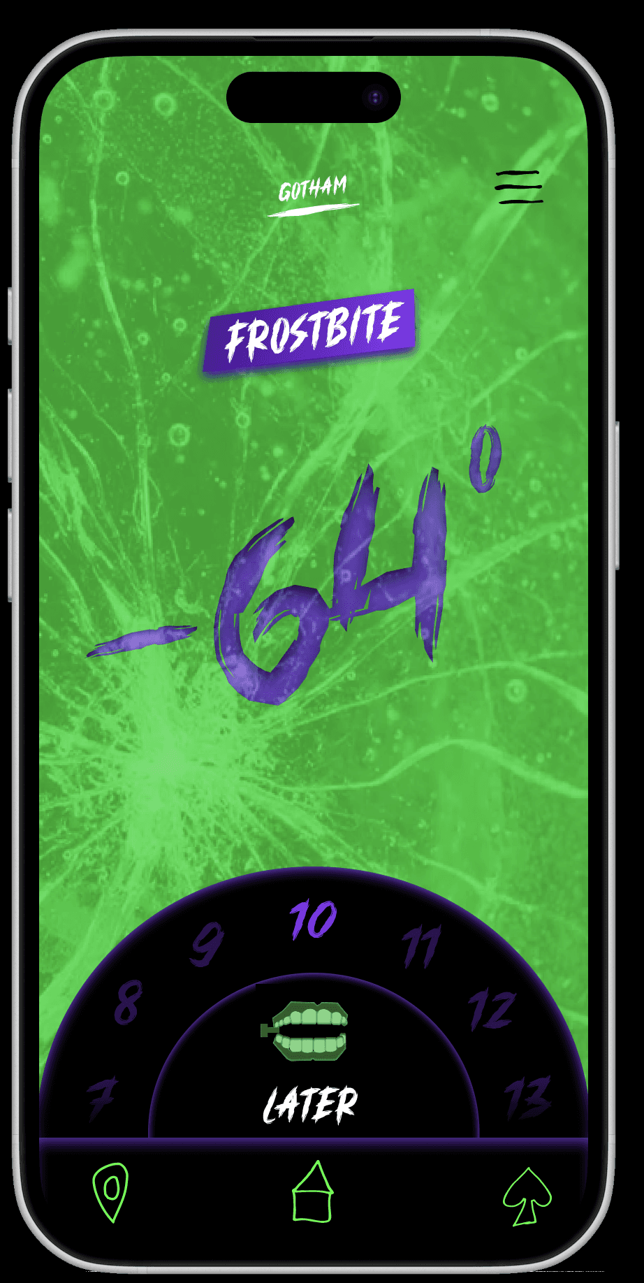 The user opens a weather app that seems normal at first, but slowly becomes unstable as the Joker takes control. The information feels unreliable and unsettling, while the app remains usable and easy to navigate.